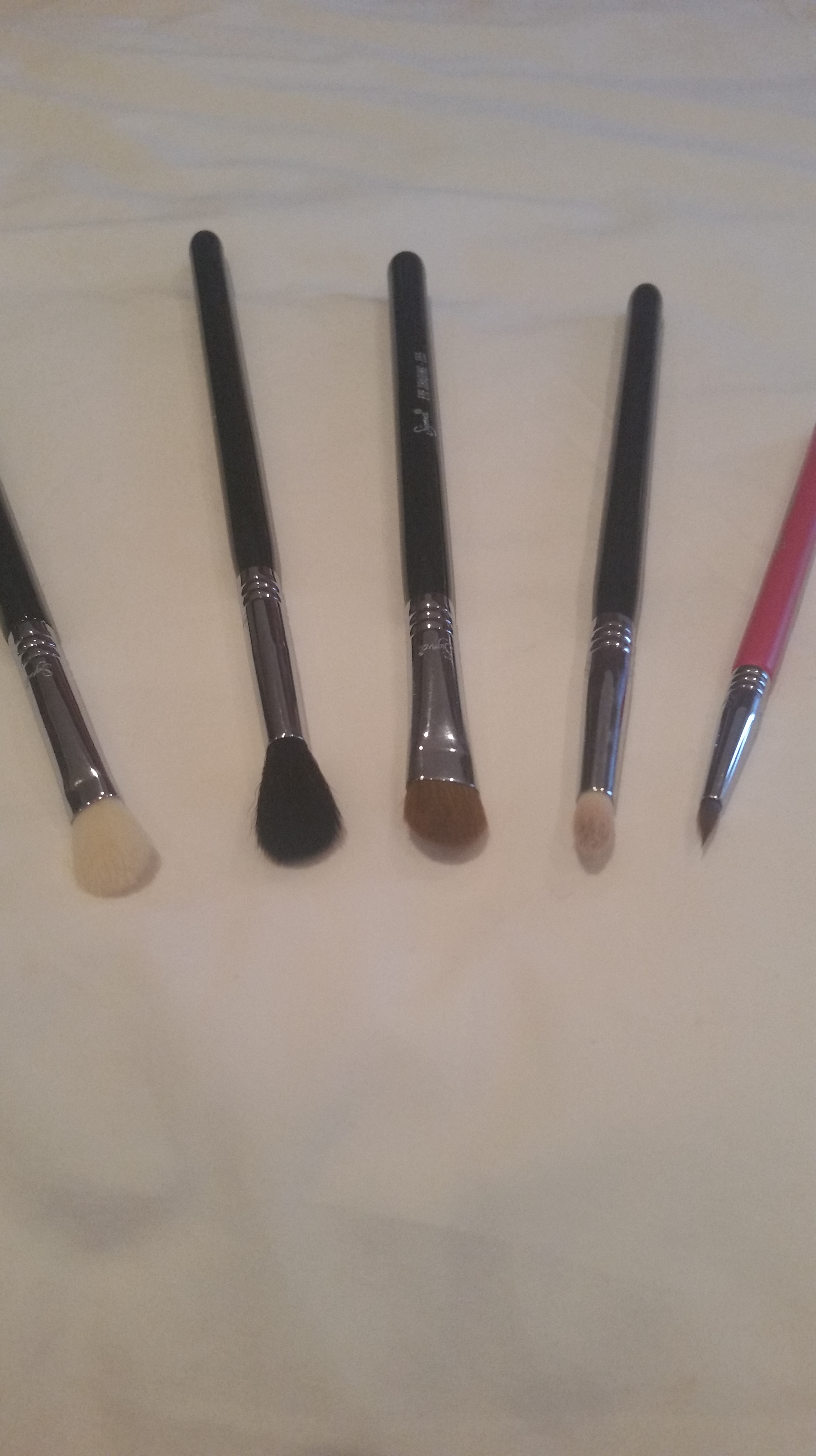 What I like most about these brushes in general is that they all have very long handles which make application very easy. Maintenance is very low also, you simply wet the head of the brush with warm water, work some cleanser or baby shampoo into it and rinse, then reshape the brush and leave it on its side to dry. Never leave brushes standing upright to dry as the water will seep into the handle and dislodge the glue that holds the bristles together. If your brush starts shedding you need to be more careful with washing it and make sure it dries on its side.